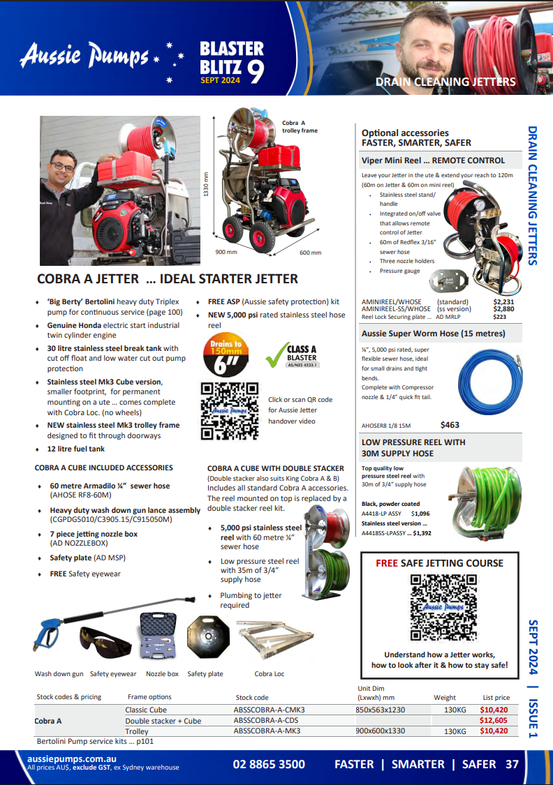 Aussie’s original Jetter, the Cobra A has the power to unblock drains up to 6” in