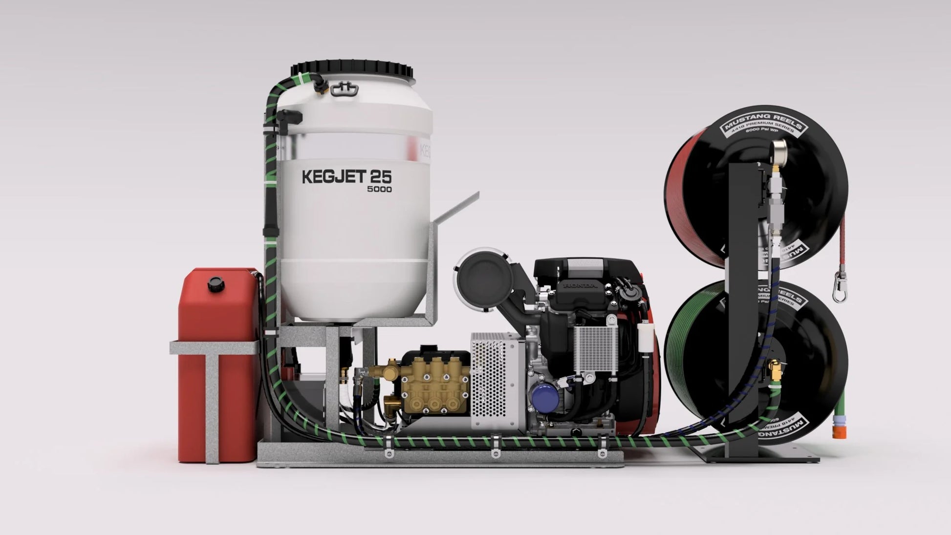 The KegJet 25 is our most popular jetter, mainly because of its modular setup that allows various installation options. Its three components are a jetter skid, double hose reel stack, and fuel tank. It features a large 60-litre (keg) water tank, 24.7 LPM @ 5000psi Bertolini Pump, Bertolini Gearbox, and iGX800 Honda Engine, all mounted on a heavy-duty galvanised chassis so you can just bolt it down.